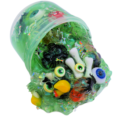 6oz Clear Pigmented Charm Bomb slime packed with tons of random assorted Halloween slime charms and decorations! Scented lightly fruit punch!